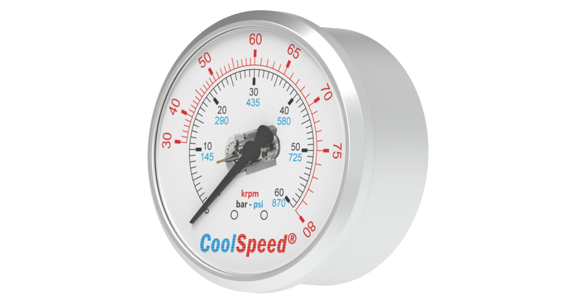 Used to measure operating pressure at spindle face. Secondary scale on gauge face indicates tool rpm.