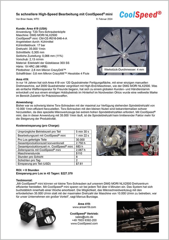 „CoolSpeed hat es uns ermöglicht, auf unserem DMG NLX2500 Drehzentrum kleine Torx-Schraubenköpfe zu fertigen, die normalerweise auf einem Langdrehautomaten bearbeitet würden. Durch den Einsatz von CoolSpeed konnten wir über 4 Minuten Bearbeitungszeit pro Teil einsparen. Es hat sich buchstäblich innerhalb einer Woche bezahlt gemacht. Es war ein riesiger Vorteil für uns das Mikrowerkzeug mit der erforderlichen Drehzahl von 35.000 1/min zu drehen – im Gegensatz zur maximalen Drehzahl der Maschine von nur 10.000 1/min.“
