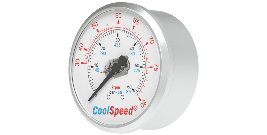 Zur Messung des Betriebsdrucks an der Spindel. Die sekundäre Skala auf der Manometerfläche zeigt die Drehzahl an.