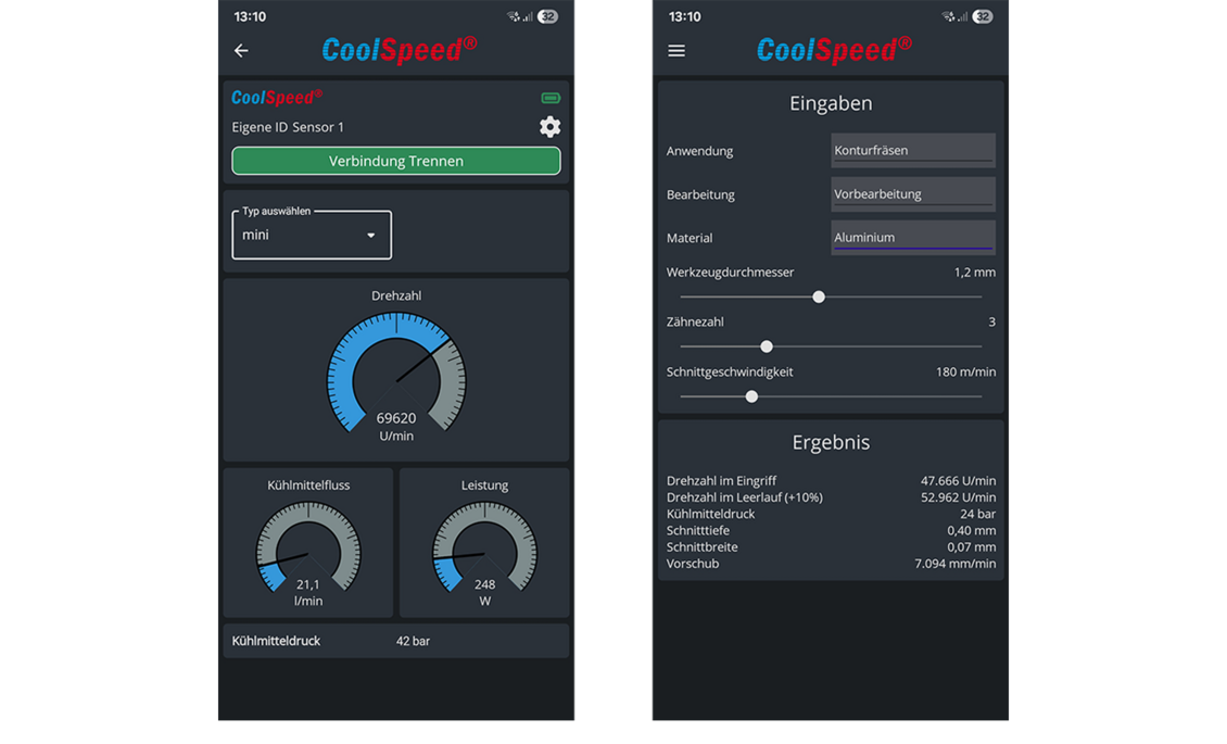 Die „CoolSpeed®“ App verbindet sich mit dem Bluetooth Manometer und zeigt die Drehzahl, den Kühlmitteldruck, den Kühlmittelfluss und die Leistung der eingesetzten High-Speed Spindel in Echtzeit an.