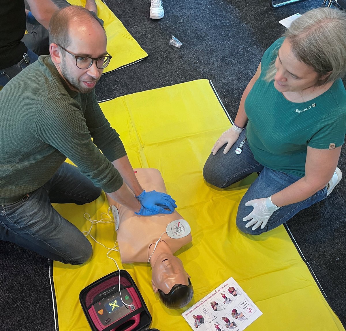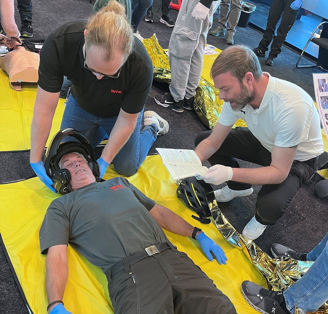 Für WTO ist es eine angenehme Pflicht ausreichend sogenannte Ersthelferinnen und Ersthelfer zu stellen. Bei der regelmäßigen Abfrage melden sich immer mehr als gesetzlich vorgegeben. Die Mitarbeiterinnen und Mitarbeiter wissen, da meist auch privat sozial engagiert, um die persönlichen Vorteile die dieser Kurs bietet. Motiviert wird in Einzel- und Gruppenarbeit das konkrete Vorgehen an geduldigen „Verletzten“ eingeübt.