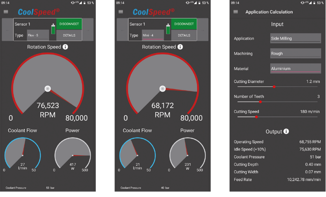 The App „CoolSpeed® Pressure Gauge“ connects to the Bluetooth Pressure Gauge and displays the rotation speed, coolant pressure, flow rate and power of the high-speed spindle in real time.