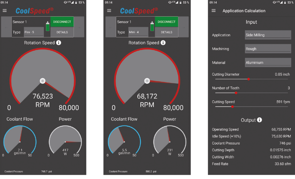 The App „CoolSpeed®“ connects to the Bluetooth Pressure Gauge and displays the rotation speed, coolant pressure, flow rate and power of the high-speed spindle in real time.