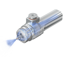 Broche porte-outil ultra haute vitesse entraînée par le liquide d'arrosage jusqu'à 60.000 tr/min avec deux turbines et un nombre de buses réglable pour doser le débit du liquide d'arrosage.