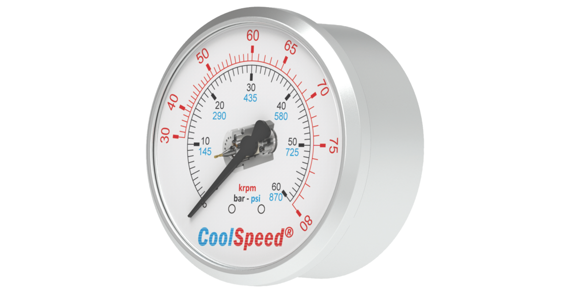 Used to measure operating pressure at spindle face. Secondary scale on gauge face indicates tool rpm.