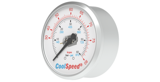 Used to measure operating pressure at spindle face. Secondary scale on gauge face indicates tool rpm.