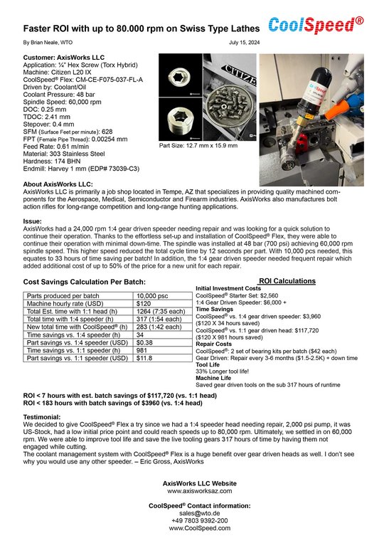 "We decided to give CoolSpeed® Flex a try since we had a 1:4 speeder head needing repair, 2,000 psi pump, it was US stock, had a low initial price point and could reach speeds up to 80,000 rpm. Ultimately, we settled in on 60,000 rpm. We were able to improve tool life and save the live tooling gears 317 hours of time by having them not engaged while cutting.